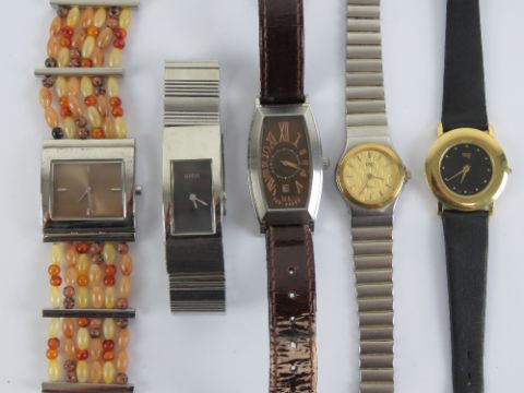 A Guess ladies stainless steel wristwatch on expanding strap. Together with four other ladies watches including; Ted Baker, Uno, and Next. Five items.