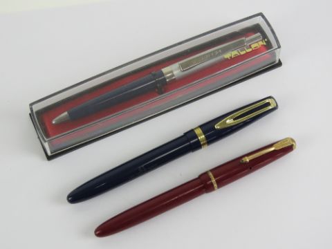 A vintage Waterman's fountain pen having 15ct gold nib, self filler lever a/f. Together with a Parker Slimfold with a 14ct gold nib. Also a Tallon ballpoint pen in box. Three items.