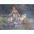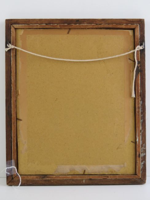 Oil on canvas behind glass; shepherdess in woods, grass in hand, sheep at foot, 27 x 22cm.