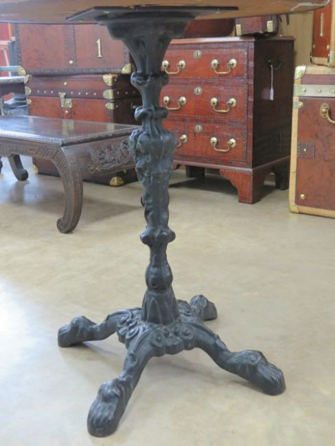 A circular beaten copper pub style table having cast iron quatreform base.