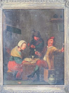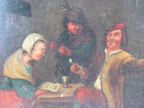 Dutch / Flemmish School; oil on copper, tavern scene, figures smoking and signing beside a table etc, unsigned, 28.5 x 23.5cm. Frame a/f.