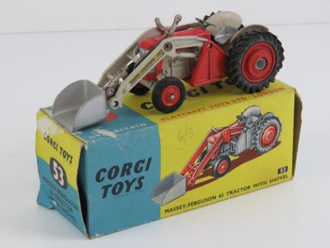 A Corgi Massey Ferguson 65 tractor with front loader and shovel, in original box.