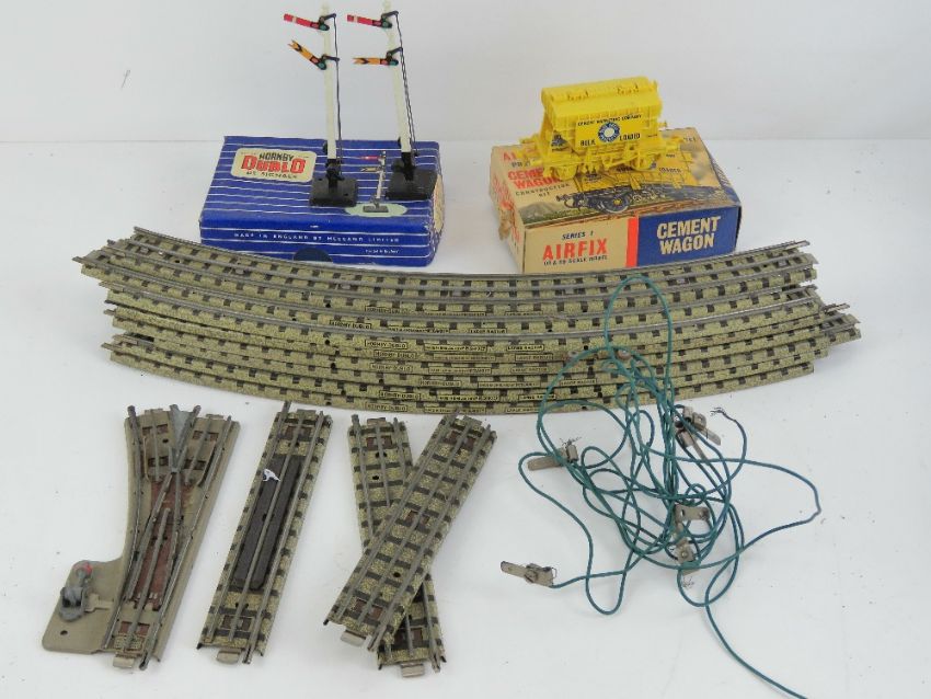 A boxed Hornby Dublo D2 double signal number two, together with an Airfix cement wagon and a quantity of live middle rail Hornby Dublo track.