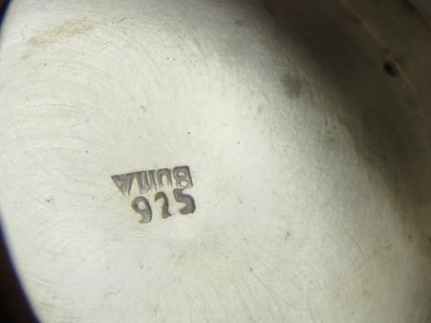 A 925 silver pill pot, hinged lid having floral engraving upon. 3cm diameter.