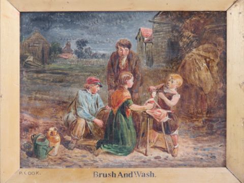 Oil on board; 'brush and wash' young children bathing a doll, attributed P. Cook, 15 x 19cm.