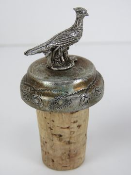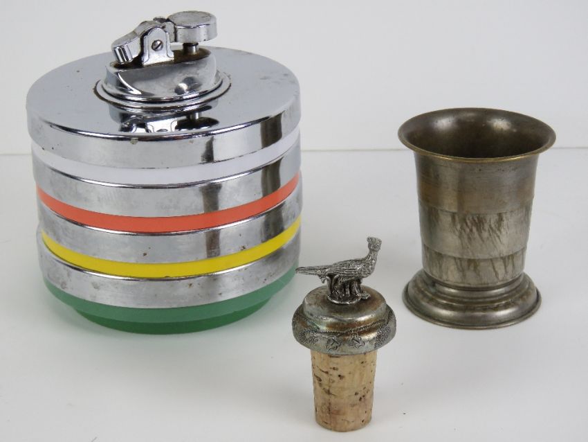 A 1960s table lighter in chrome having three stacking smokers receptacles. Together with a silver plated tot cup and a stopper having pheasant upon. Three items.