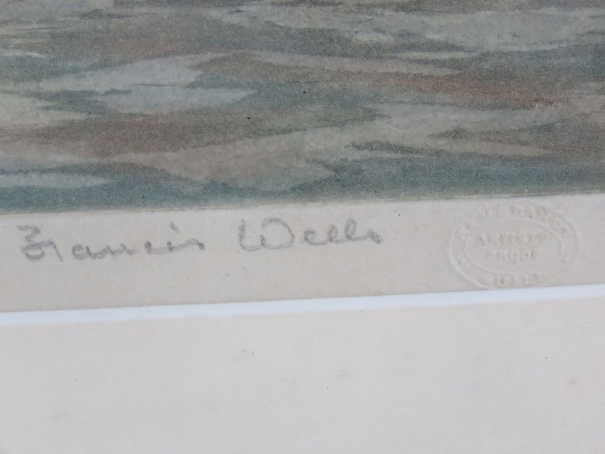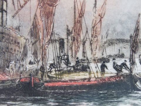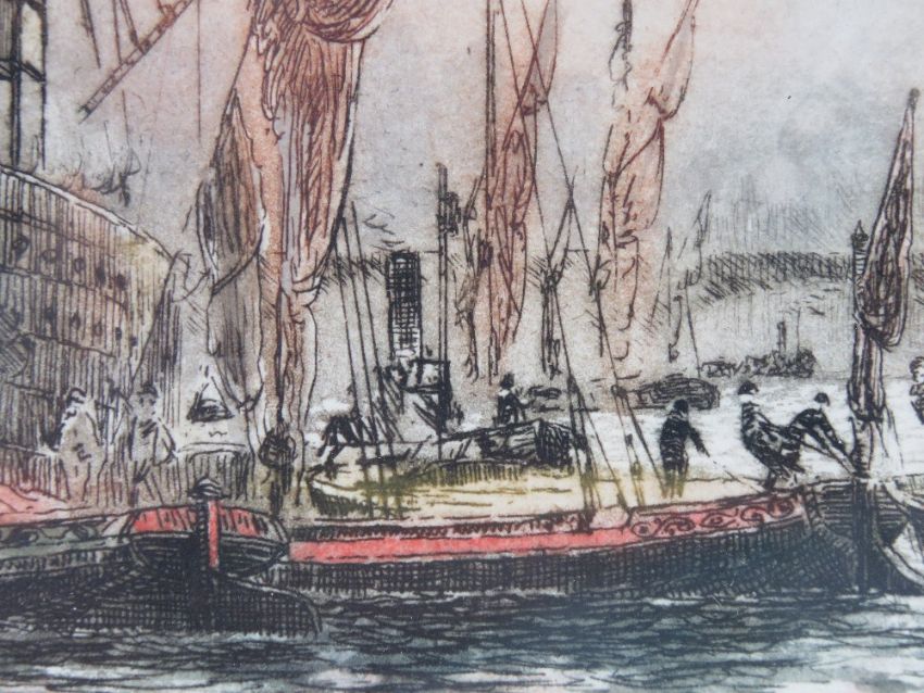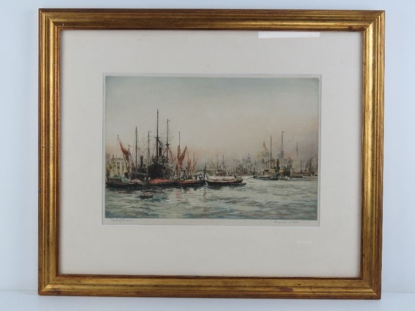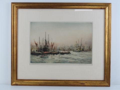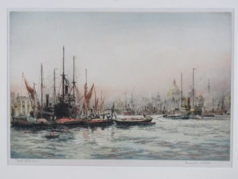Coloured print; Pool of London by Francis Wells a Rembrandt Guild Artists Proof, 16 x 36cm.