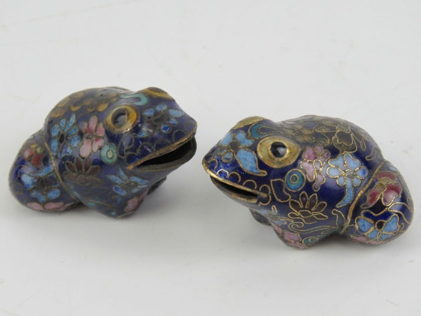 A miniature early 20th century cloisonné chamber stick, 4cm high, together with a pair of floral cloisonné frogs each measuring 4cm in length.
