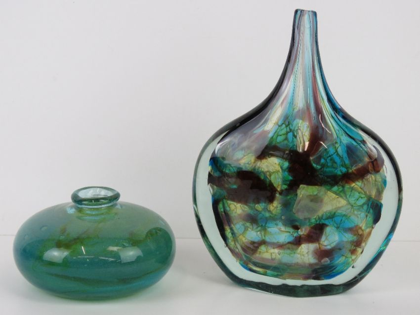 A short glass mottled blue and green vase, 8cm high, together with an Art Glass stem vase, 25cm high, probably by Murano. Two items.