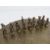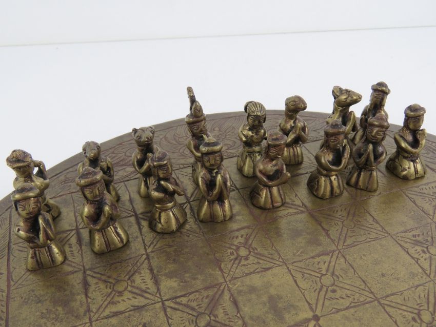 An unusual Oriental chess set having engraved brass board and metal pieces. Board 28.5cm diameter, chess pieces 3 to 4.5cm high.
