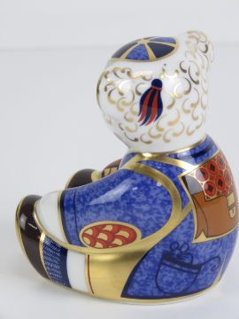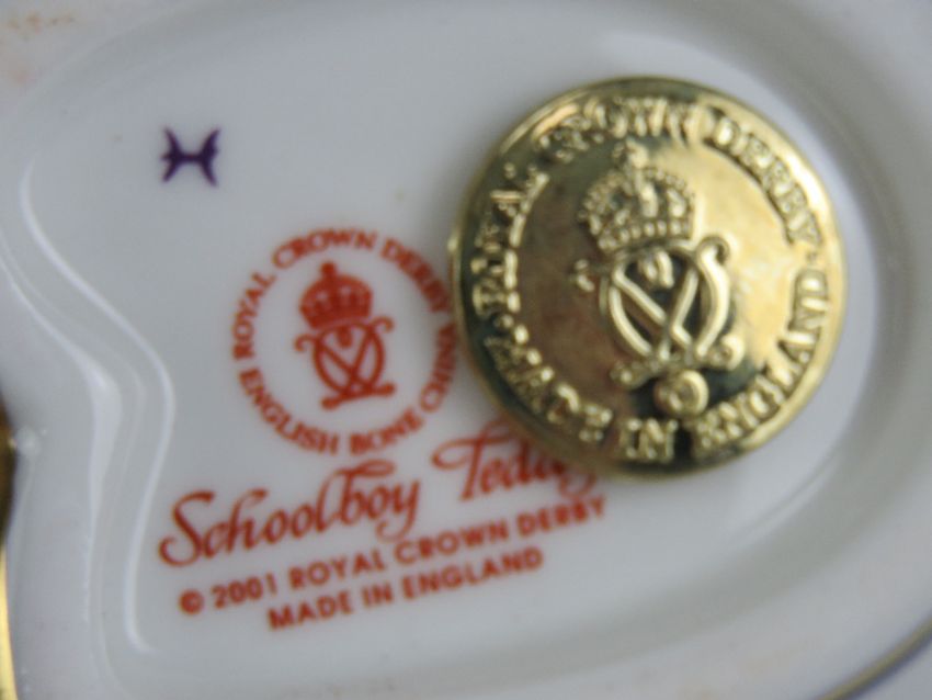 Royal Crown Derby Paperweight; 'School Boy Teddy', gold stopper or button, with box.