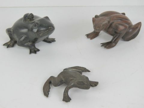 An Oriental style painted brass frog, together with a cast brass frog, 6cm, and a rosewood frog (a/f), 9cm. Three items.