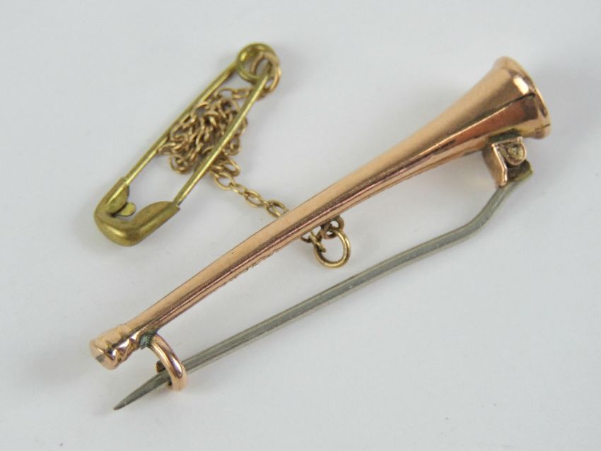 A Victorian 9ct rose gold stock pin or brooch in the form of a hunting horn, stamped 9 carat with makers mark S.Bros, 3.8cm in length, white metal pin, with safety chain. Total weight 1.4g.