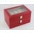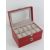A red faux crocodile skin two tier watch box having perspex viewing pane and opening to reveal cushions for twenty watches (one cushion deficient), lower latch slightly a/f. 25.5 x 17 x 15cm.