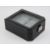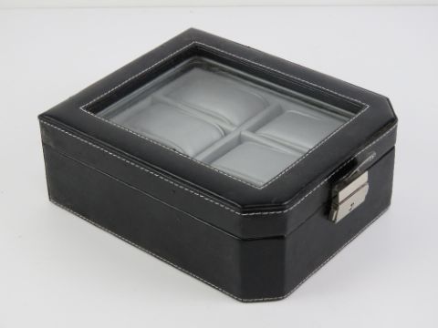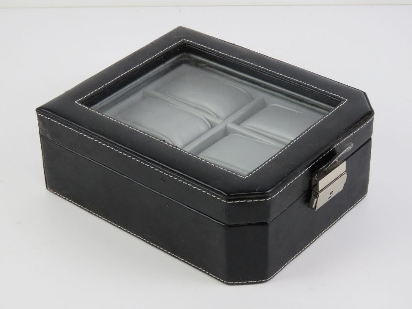 A black leatherette watch box having perspex viewing pane and opening to reveal cushions for six watches. 20 x 16 x 7.5cm