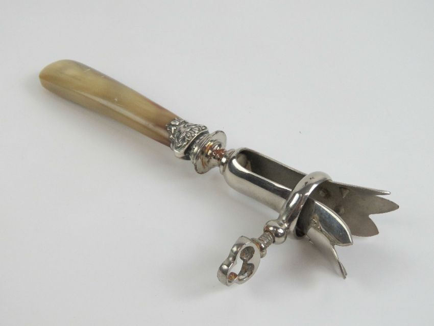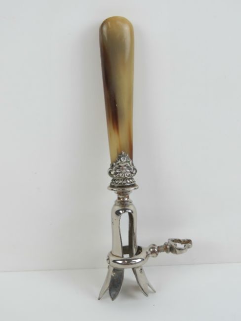 A late 19th / early 20th century French silver plate and horn Manche a Gigot (Lamb Handle) with a decorative collar and trefoil topped screw.