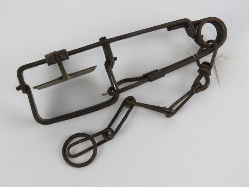 A vintage mole trap complete with tethering chain, together with a vintage rat trap 'The Nipper'. Two items.