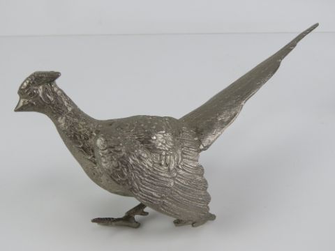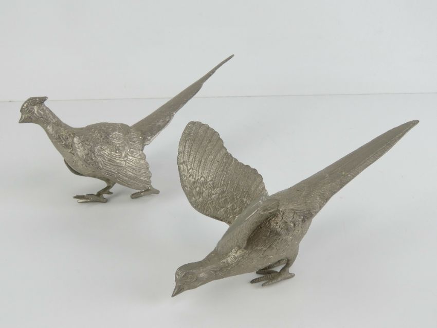 A pair of silver plated table centrepiece fighting pheasant decorations, each approx 23cm in length.