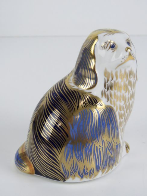 Royal Crown Derby Paperweight; 'King Charles Spaniel', gold stopper or button, with box.