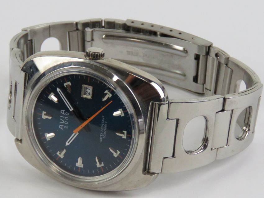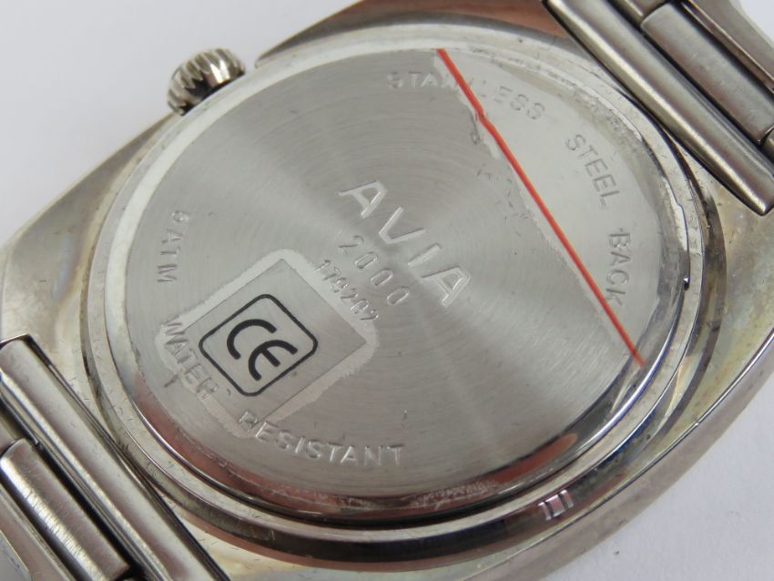 An Avia 2000 stainless steel wristwatch 'as new' with plastic film to case back, in presentation box. Having teal blue dial with date aperture.