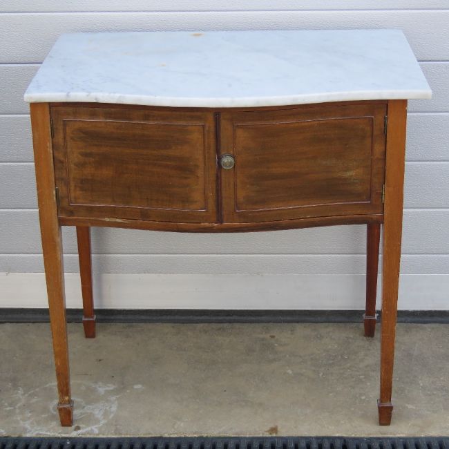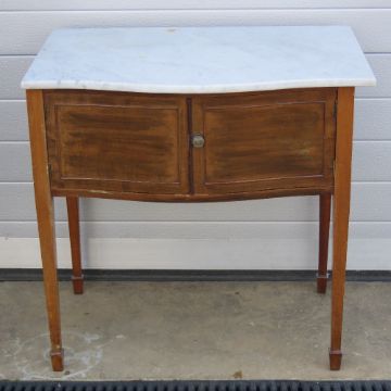 An Edwardian marble top bow fronted double door wash stand, raised over square tapering legs, 77 x 51cm, 77cm high.
