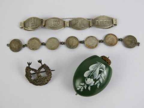 A vintage leatherette jewellery box having purple fabric lining and containing; a HM silver souvenir bracelet having six panels featuring London landmarks upon and weighing 22.8g, silver three pence bracelet, stag themed brooch and green ceramic pomander. Five items.