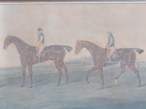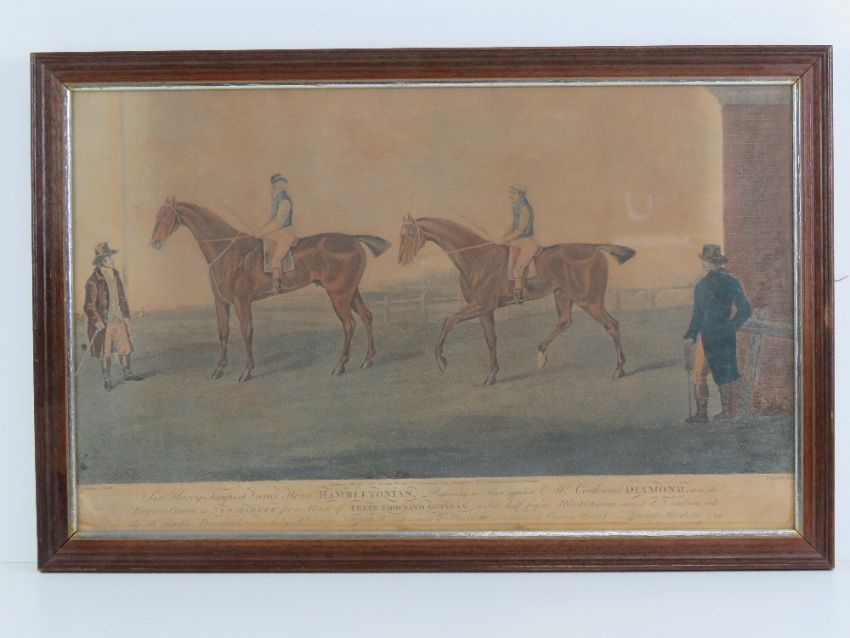 Coloured engraving; two horses being 'Sir Harry Tempest Vanes Horse Hambletonian - Preparing to Start against Mr Cooksons Diamond over the Beacon Course at Newmarket for a match of Three Thousand Guineas.... Monday March 25. 1799'. J. N. Sartorious Pinxit. Whessell Fecit. Published March 1. 1800 by John Harris. No. 3, Sweetings Alley, Cornhill & No. 8. Old Broad Steet, London. Image size 51 x 27.5cm, Framed.
