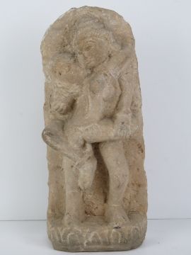 A hand carved stone figurine of Indo Asian erotic influence showing the union between man and woman, 31cm high.