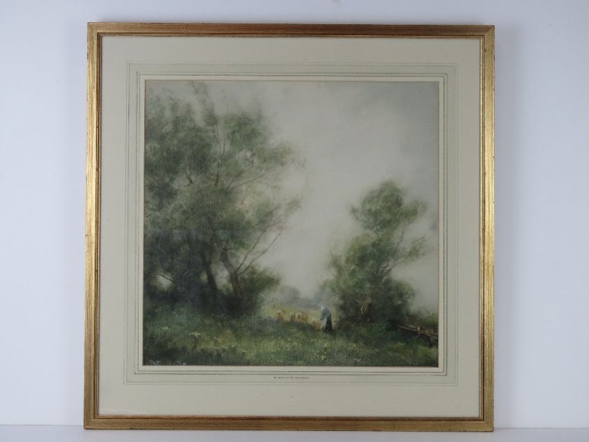 William Tatten-Winter RBA (1855-1928) watercolour; rural scene, sheep with shepherdess, trees and field beyond, signed lower left, 43 x 44cm.