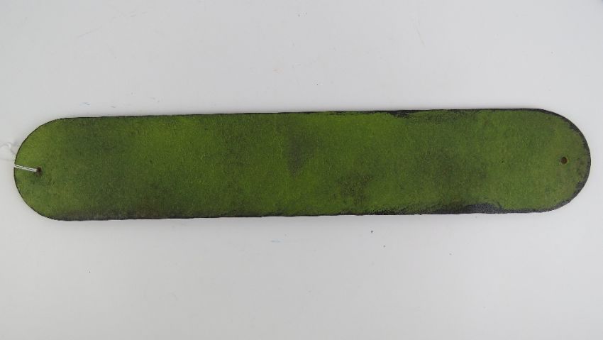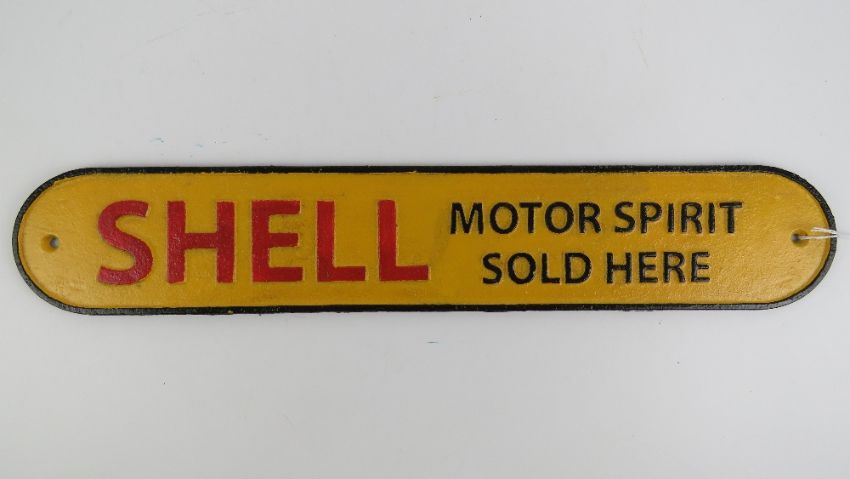 A cast metal 'Shell Motor Spirit Sold here' sign in yellow ground, 50cm wide.