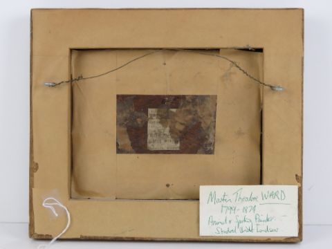 Martin Theodore Ward (1799 - 1874) oil on panel; a stout grey horse tacked and ready for action, spaniel and goat at foot, 15 x 19.5cm, bearing label verso, in later frame.