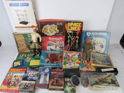 A quantity of vintage toys and puzzles including two Action Man dolls,