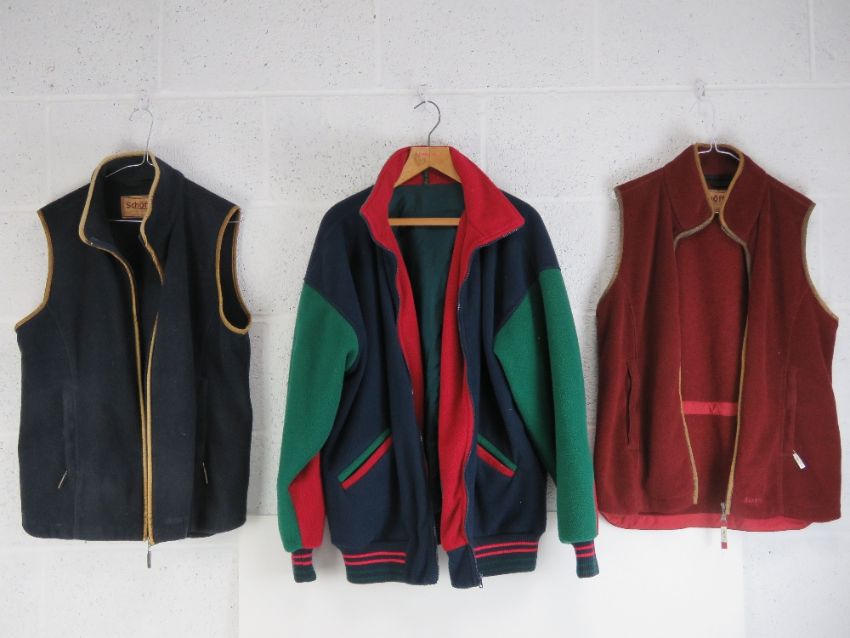 Outdoor clothing; four gilets, fleece size 14 and 16, others size 42" and L, coat size 38", and fleece jacket by Mister Fox Limited, size L. Six items.