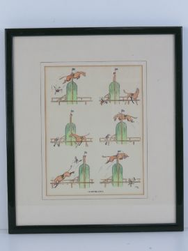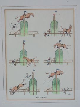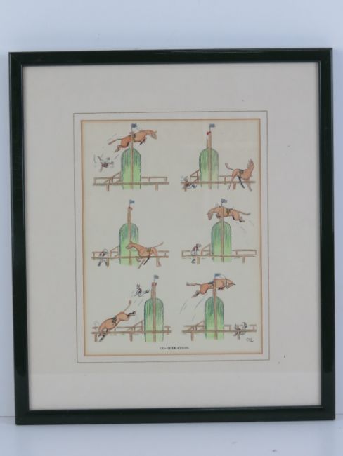 A hand coloured cartoon print showing the recognisable union between horse and rider entitled 'Union, 23 x 18cm.