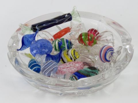 A glass bowl containing a large quantity of glass 'sweets' within.