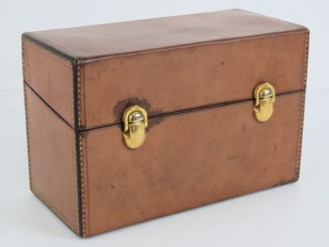 A set of four spirit flasks in fitted pigskin leather case, each having glass stopper and gilded metal screw top lid, twin brass fasteners to front, brass stud feet, box measuring 20.5 x 13.5 x 10cm, The bottles each measure 9.8 x 9 x 4.7cm.
