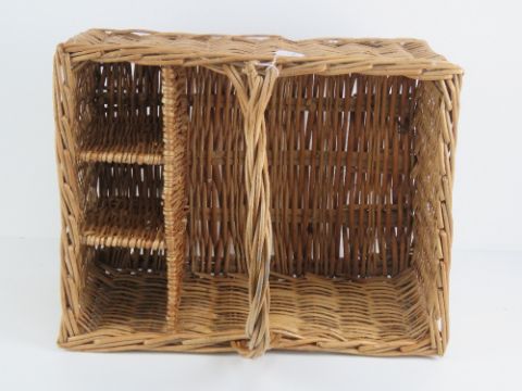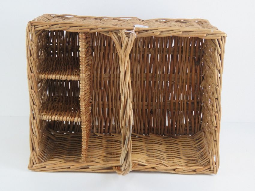 A wicker picnic basket having loop handle and dividers to hold three bottles, 48 x 38cm.