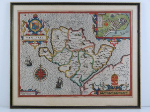 A 17th Century county map of Anglesey from 'Theatre of Great Britain' by John Speede, hand coloured, published by Thomas Bassett and Richard Chiswell, with inset town of Beaumaris and fortress, the shield of Anglesey, the King's coat of arms etc, having alphabetical table of Anglesey towns verso. 51 x 39cm.