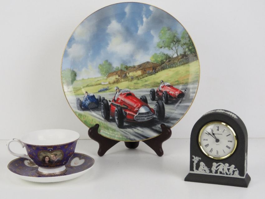 1950 Grand Prix; a Coalport decorative plate designed by Gordon Davis, featuring an Alfa Romeo Type 158 driven by Guiseppe (Nino) Farina leading a French Talbot and a Ferrari, No 470 of 2500, 27cm dia. Together with a Gleneagles commemorative cup and saucer and a Wedgwood clock. Three items.