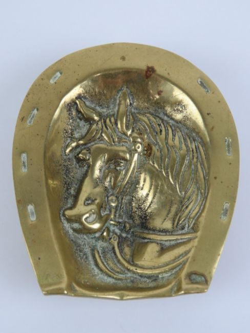 A brass pin tray having hoses head and shoe design upon, 10.5 x 9cm.