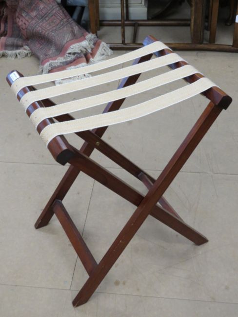 A 'X' framed mahogany suitcase stand with canvas straps, 63cm high.