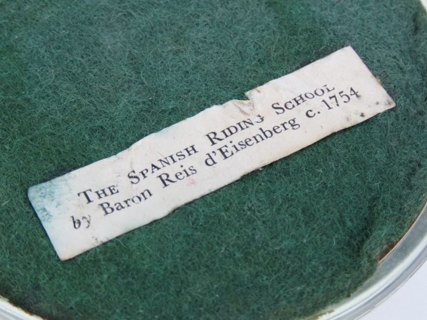 'The Spanish Riding School' by Baron Reisd'Eisenberg c.1754, print within glass paperweight, 9cm dia.