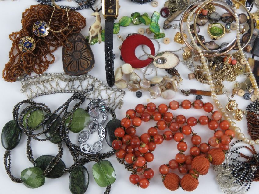 A quantity of assorted costume jewellery inc malachite bead necklace, bangles, shell bracelets, hematite elephant pendant and bead necklace, etc. Also a Pierre Cardin ladies wristwatch.