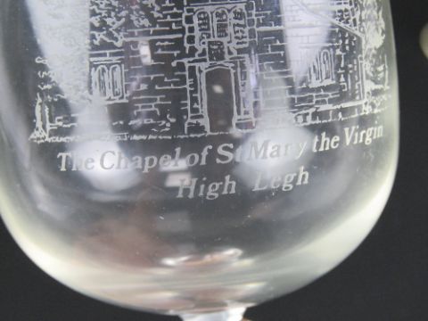A pair of wine glasses having etched Chapel of St Mary the Virgin Highlegh upon, being Nos 7 and 8 of 250 and each standing 16cm high.