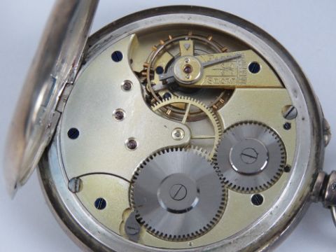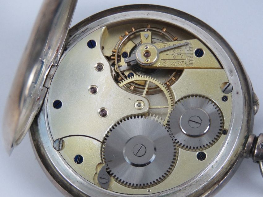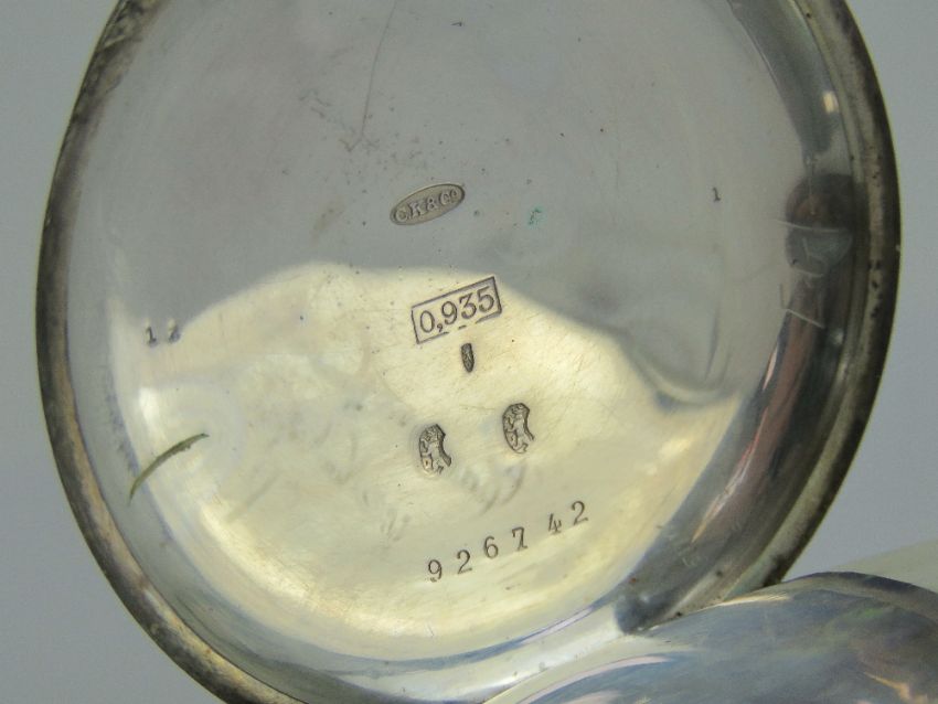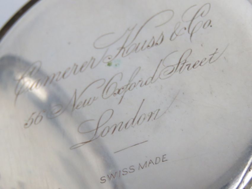 A 935 Swiss silver top wind open face pocket watch, inner case engraved Camerer Kuss & Co 56 New Oxford Street London, having white enamel dial with black Roman numerals, subsidiary seconds dial and blue steel hands, 50mm diameter, total weight 100.3g.