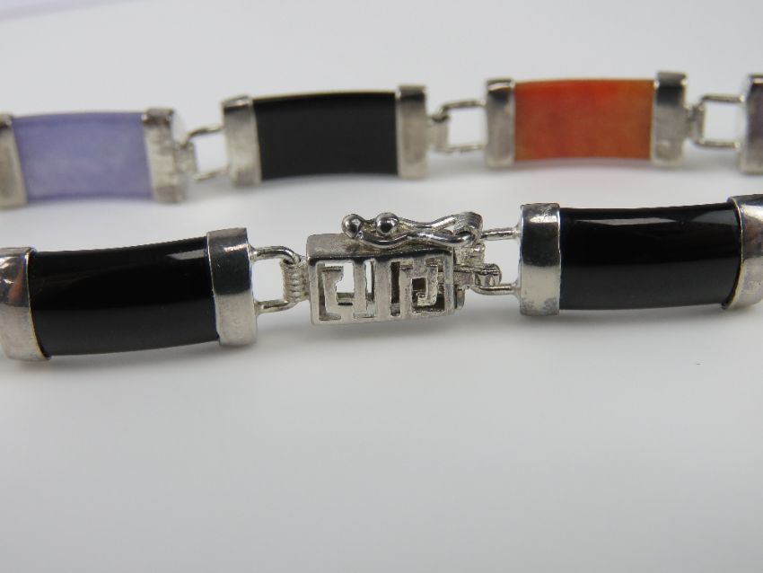 A jade and onyx panelled bracelet having white metal fittings (partial mark indistinct), 19cm in length.