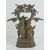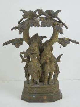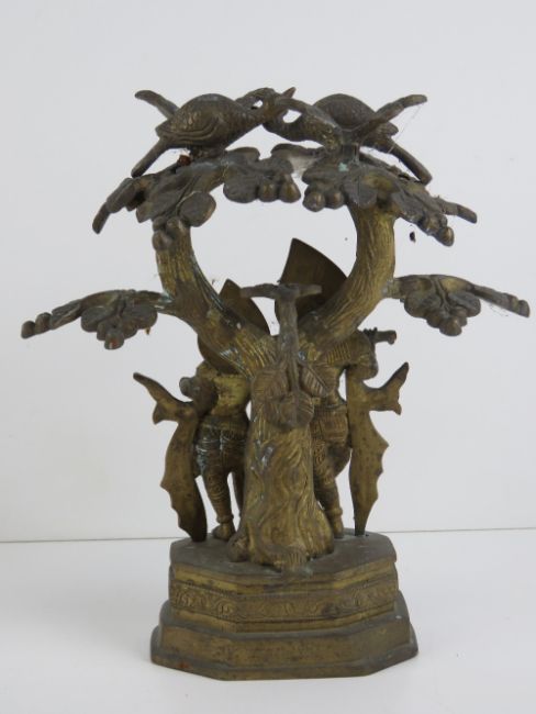 A heavy brass Indo Asian figurine of male playing musical instrument and female in traditional dress, stood below the branches of a tree having a pair of peacocks perched at the top, all standing 26cm high,