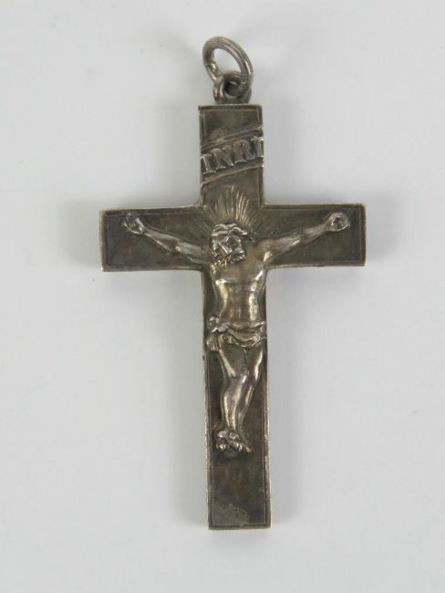 A HM silver INRI crucifix (Iesvs Nazarenvs Rex Ivdaeorvm - Jesus of Nazareth the King of the Jews), hallmarked Birmingham 1915, 4.8cm inc bale.