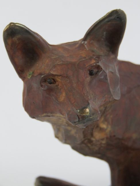 A fine cold painted bronze seated fox figurine by Michael Storey, signed to back of tail, measuring 12cm high, 1.073kg.