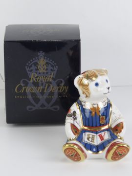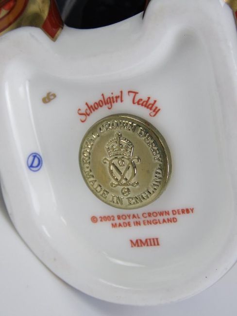 Royal Crown Derby Paperweight; 'School Girl Teddy', gold stopper or button, with box.